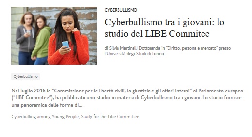 Nel luglio 2016 la “Commissione per le libertà civili, la giustizia e gli affari interni” al Parlamento europeo (“LIBE Commitee”), ha pubblicato uno studio in materia di Cyberbullismo tra i giovani. Lo studio fornisce una panoramica delle forme di cyberbullismo poste in essere e dell’estensione del fenomeno, analizza le misure adottate dall’Unione europea e degli Stati membri e individua, ad entrambi i livelli, ulteriori misure da adottare per contrastarlo e prevenirlo.